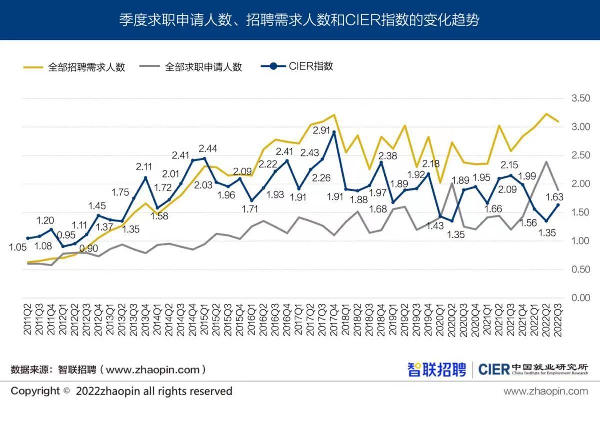 近日,中国人民大学中国就业研究所联合智联招聘出品的《2022年三季度 中国就业市场景气报告》出炉。报告显示,从就业形势来看,三季度就业供需两端均发生减少,但由于求职供给端减少更快,CIER指数从二季度的1.35增加至1.63。同比方面,招聘需求人数增幅小于求职申请人数,CIER指数不仅低于去年同期2.15,还低于2020年同期水平。(注:CIER指数是用来反映就业市场景气程度的指数,其计算方法是:CIER指数=市场招聘需求人数/市场求职申请人数)
